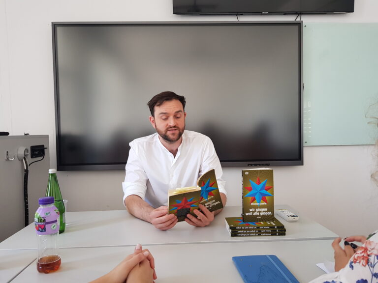 Lectura a fost urmată de o conversație între autor și public despre experiențele străinătății și ale înstrăinării, începând cu întrebarea adresată de către autor studenților anilor I și II de masterat și ai anului II de licență, dacă ar studia germana pentru a merge în Germania.