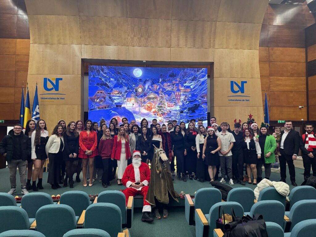 Seara Colindelor, organizată de Asociația Studenților Geografi din Timișoara (GEOTIM) și Facultatea de Chimie, Biologie și Geografie, a fost un eveniment care a reunit studenți, profesori și invitați într-un cadru festiv, marcat de colinde și de spiritul sărbătorilor de iarnă. Momentul apariției lui Moș Crăciun a completat programul serii și a adus un plus de entuziasm, în special pentru cei mici.