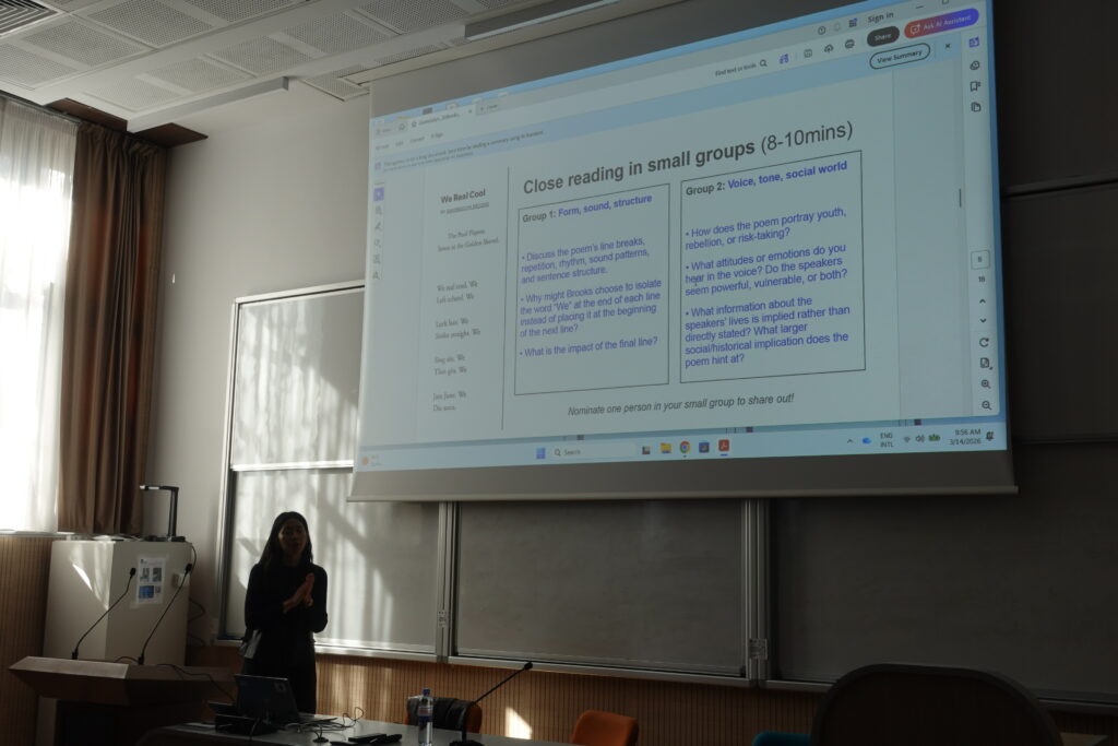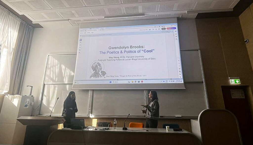 Pe 14 martie 2026, Centrul de Studii Americane al Facultății de Litere, Istorie, Filosofie și Teologie a găzduit prima întâlnire a anului 2026 în seria The Fulbright Lectures. Invitată a fost May HONG, M. Ed. Harvard University, Fulbright Teaching Fellow la Universitatea Lucian Blaga, Sibiu. Tema propusă masteranzilor și doctoranzilor în Studii Americane, în cadrul cursului de literatură a minorităților etnice din SUA, a fost ”Gwendolyn Brooks: The Poetics and Politics of „Cool, prelegerea fiind găzduită de Prof. Dr. Habil. Cristina Chevereșan. Concentrându-se pe figura uneia dintre cele mai cunoscute scriitoare americane ale secolului XX, prima poetă de culoare câștigătoare a Premiului Pulitzer, conferința interactivă a pornit de la unul dintre cele mai cunoscute texte ale acesteia.