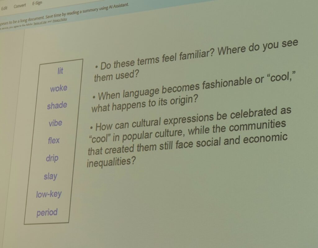 Angajându-i pe studenți într-o serie de activități pe echipe, cu task-uri atent distribuite, întâlnirea a decurs asemenea unui workshop de analiză literară și culturală, mizând atât pe cunoștințe de specialitate, cât și pe conectarea acestora cu fundalul socio-istoric al operei lui Brooks. Participanții au avut ocazia să descopere legături și nuanțe neașteptate în spatele aparentei concizii a poemului ”Cool”, acestea înscriindu-se într-o radiografie generoasă a întrepătrunderii dintre analizele discursului literar, lingvistic, civilizațional și recognoscibilitatea sau chiar aplicabilitatea practică a acestora în viața cotidiană a adolescentului de secol XXI. Secvențele de rap inspirat din poezia lui Gwendolyn Brooks au subliniat actualitatea stilului și subiectelor abordate, studenții experimentând o abordare la zi a artei scrisului transformată simultan în act performativ și exercițiu de gândire critică.