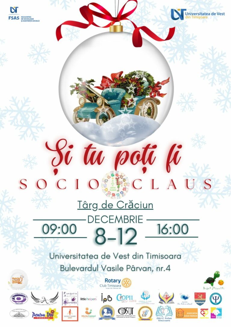 Holul de la parterul Universității de Vest din Timișoara va găzdui în această perioadă Târgul de Crăciun, cu decorațiuni specifice sărbătorilor de iarnă, realizate de copii cu dizabilități, părinți, adulți cu dizabilități și terapeuți în scopul acoperirii costurilor terapiilor, medicamentelor sau echipamentelor specifice, necesare acestora. Târgul va fi deschis publicului zilnic, în intervalul orar 9.00-16.00. Informațiile privind programul detaliat al campaniei pot fi accesate pe pagina de social-media Socio Claus.