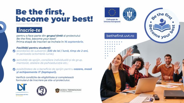 Proiectul „Be the first, become your best!”, implementat de Universitatea de Vest din Timișoara (UVT), își propune să contribuie la combaterea abandonului universitar și la creșterea numărului de absolvenți de studii universitare dintr-o categorie socială foarte specifică, deseori ignorată de măsurile de sprijin existente: tinerii proveniți din familii cu un nivel educațional scăzut, al căror părinți nu au absolvit studii universitare și care ar putea deveni, astfel, primii studenți din familiile lor. Așadar, vor fi sprijiniți studenți ai ciclului de studii universitare de licență, pentru a le oferi suportul necesar pentru a urma studii universitare.