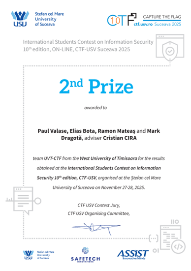 În luna noiembrie 2025, studenții din echipa UVT-CTF a Universității de Vest din Timișoara au participat la concursul internațional de securitate informatică CTF-USV 2025 (Capture The Flag), organizat de Universitatea „Ștefan cel Mare” din Suceava. Competiția, ajunsă la a X-a ediție și desfășurată online, a reunit echipe de studenți de la universități tehnice și instituții de învățământ superior din România și din străinătate, axându-se pe probe practice de securitate cibernetică și testare a vulnerabilităților în aplicații web și sisteme de operare. (mai multe detalii: ctf.usv.ro)