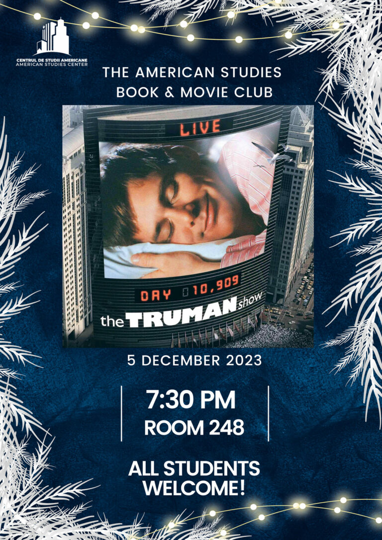 Filmul profetic The Truman Show (1998), scris de Andrew Niccol și regizat de Peter Weir, a fost alegerea studenților de această dată. Discuția moderată de Raul Săran, asistent de cercetare în cadrul Departamentului de Studii Românești, fost masterand și doctorand în Studii Americane și membru colaborator CSAM, a atins cele mai importante teme legate de film, precum: voyeurismul mediatic, obsesia pentru reality TV și pentru așa-zisa autenticitate, cât de reală sau fabricată poate fi „realitatea”, dependența de divertismentul pueril, pierderea liberului arbitru într-o lume distopică, controlată de media și consumerism. Controversatul film a anticipat dependența actuală de rețelele de socializare, auto-expunerea constantă favorizată de acestea, paranoia supravegherii prin mijloace tehnologice tot mai avansate.