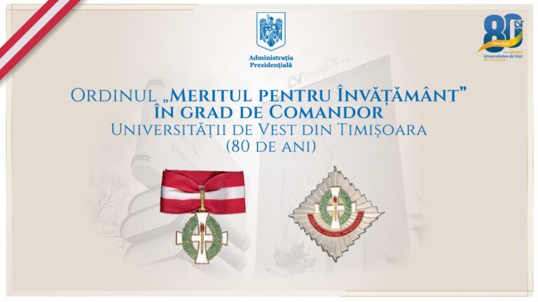 Cu prilejul Zilei Naţionale a României, în semn de înaltă apreciere pentru rezultatele importante obținute în procesul de formare intelectuală și umană a tinerelor generații, pentru promovarea calității învățământului universitar românesc, Președintele României a conferit Ordinul „Meritul pentru Învățământ” în grad de Comandor Universității de Vest din Timișoara, la aniversarea celor 80 de ani de la înființare.