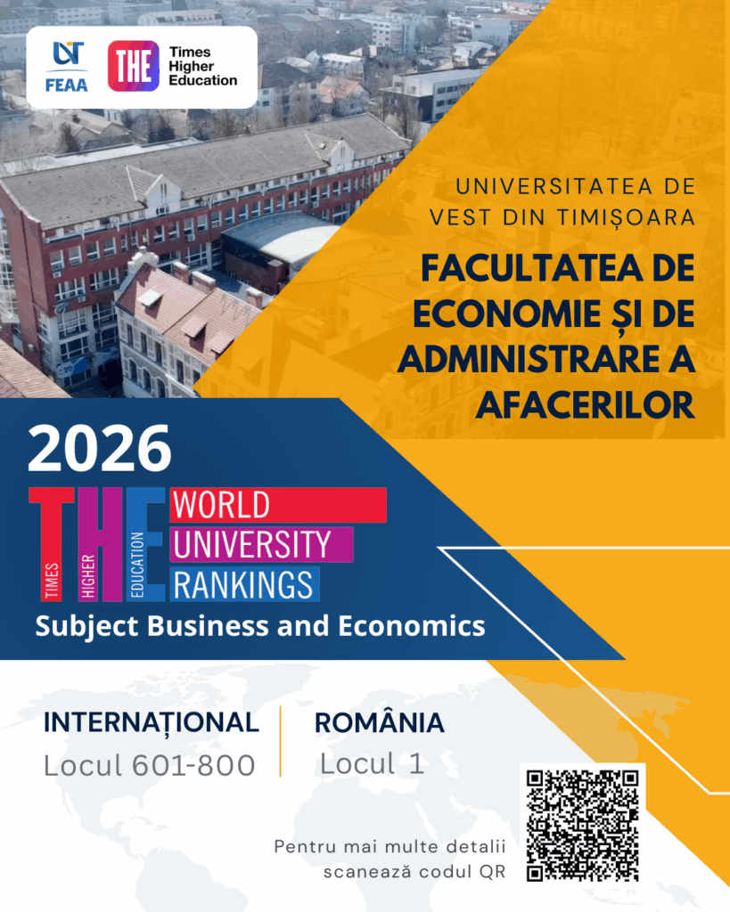 Facultatea de Economie și de Administrare a Afacerilor din cadrul Universității de Vest din Timișoara (UVT-FEAA) este, din nou, prezentă în Times Higher Education Subject Rankings 2026, în domeniul Business & Economics, unul dintre cele mai competitive la nivel internațional.