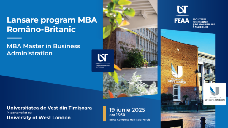 Facultatea de Economie și de Administrarea a Afacerilor din cadrul Universității de Vest din Timișoara are plăcerea de a anunța desfășurarea evenimentului de lansare a noului program MBA (Masterat în Administrarea Afacerilor), organizat în cadrul parteneriatului dintre Universitatea de Vest din Timișoara (UVT) și University of West London (UWL), care va avea loc joi, 19 iunie 2025, începând de la ora 16:30, la Sala Verdi a Iulius Congress Hall.