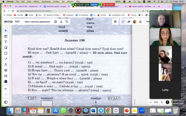 În data de 19.05.2023 a avut loc atelierul cu tema „Verbele de mișcare în limba rusă”, în format online, propus de către Cristina Malyar, absolventă a specializării de limba și literatura rusă, din cadrul Facultății de Litere, Istorie și Teologie. În prezent, Cristina Malyar este doctorandă în anul al II-lea la Institutul de Stat de Limba Rusă A.S. Pușkin din Moscova, unde, sub îndrumarea prof. univ. dr. Tatiana Veselovskaia, scrie teza de doctorat cu titlul „Modele interactive de tip media în predarea limbii ruse ca limbă străină”.