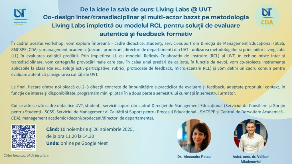 Prin această inițiativă, UVT își consolidează angajamentul pentru o evaluare colaborativă, reflexivă și orientată spre creșterea calității predării și a experienței educaționale.