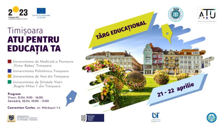 Târgul educațional pentru elevi „ATU pentru educația ta” se va desfășura în perioada 21-22 aprilie 2023, la Sala Convention Center a Hotelului Timișoara (str. Mărășești nr. 1-3), și va reuni oferta programelor de studii ale celor patru universități publice din Timișoara și vine în întâmpinarea dorinței elevilor de a se informa și a fi consiliați în alegerea viitorului parcurs de formare. Avem bucuria de a vă invita să participați la deschiderea evenimentului „ATU pentru educația ta”, care va avea loc vineri, 21 aprilie 2023, de la ora 10 (la Sala Convention Center a Hotelului Timișoara).