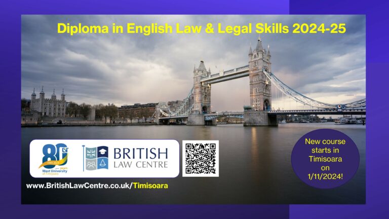 Începând cu anul universitar 2024-2025, Facultatea de Drept a Universității de Vest din Timișoara (UVT) va oferi, în cadrul unui parteneriat cu British Law Center (BLC), un program de studiu de un an în drept englez – Diploma in English Law and Legal Skills.
