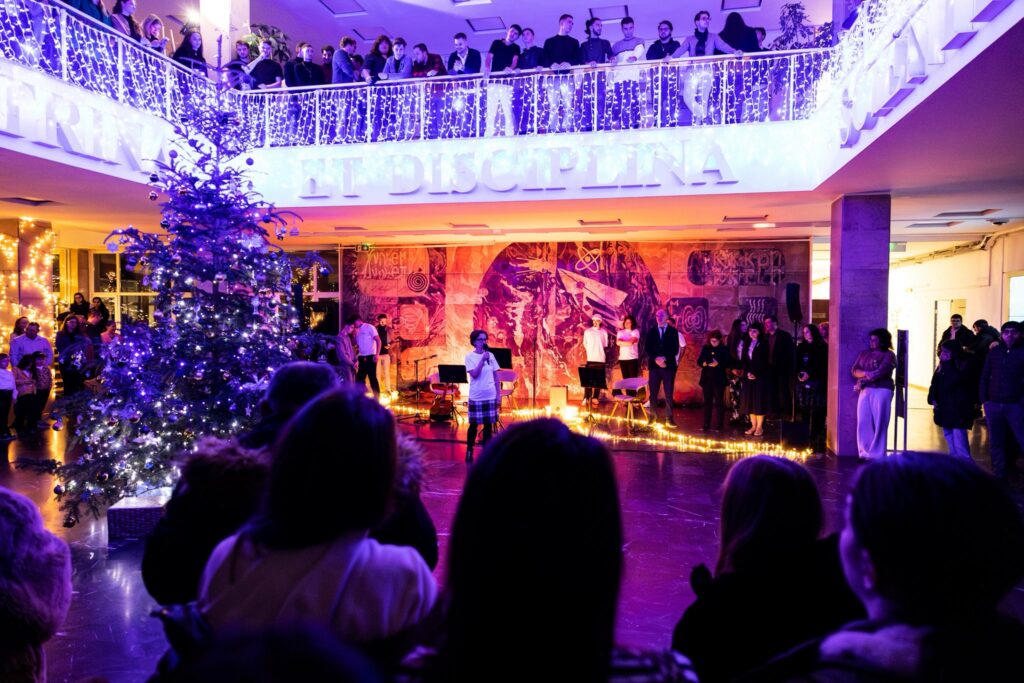 În sediul principal al Universității de Vest din Timișoara s-au auzit și melodiile oferite de elevi colindatori din instituțiile de învățământ timișorene, de la Liceului Teoretic „Jean Louis Calderon”, Liceul de Artă „Ion Vidu”, alături de mai multe grupe și trupe muzicale reprezentative ale școlilor, care ne-au trecut pragul și ne-au adus bucuria sărbătorilor prin glasuri curate, emoție și zâmbete sincere. Colindele lor au umplut spațiul de căldură și ne-au reamintit cât de frumoase sunt tradițiile atunci când sunt trăite și împărtășite din suflet. Ca orice colindători adevărați, micii noștri oaspeți au fost întâmpinați de spiridușii UVT, care le-au pregătit surprize dulci, pe măsura entuziasmului lor. Le-am mulțumit și i-am felicitat pentru curajul, bucuriea și spiritul sărbătorilor pe care l-au adus în comunitatea noastră.