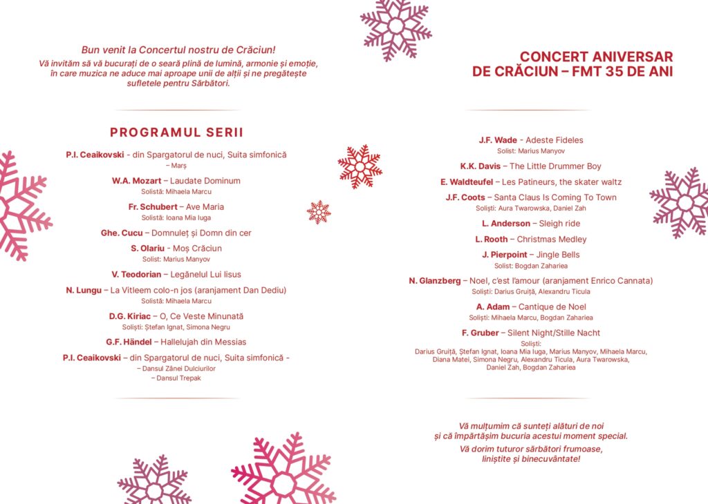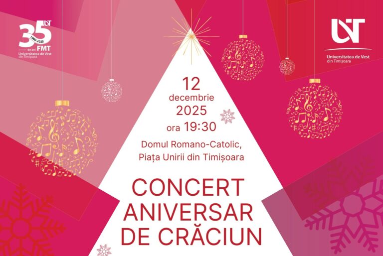 Universitatea de Vest din Timișoara, Facultatea de Muzică și Teatru, vă invită la Concertul Aniversar de Crăciun cu ocazia celebrării celor 35 de ani de excelență artistică, vineri, 12 decembrie, ora 19:30, la Domul Romano-Catolic din Timișoara.