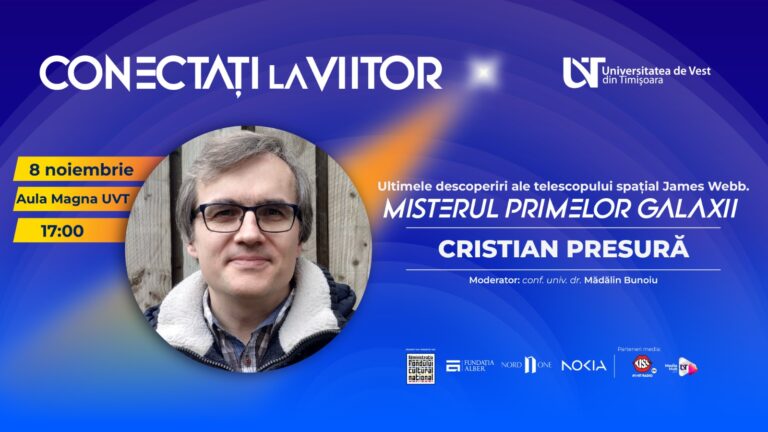 Evenimentul, intitulat „Ultimele descoperiri ale telescopului spațial James Webb. Misterul primelor galaxii”, va avea loc în Aula Magna, de la ora 17:00. Cristian Presură va prezenta cele mai recente observații și rezultate obținute de telescopul spațial James Webb, dezvoltat de NASA, Agenția Spațială Europeană (ESA) și Agenția Spațială Canadiană (CSA).