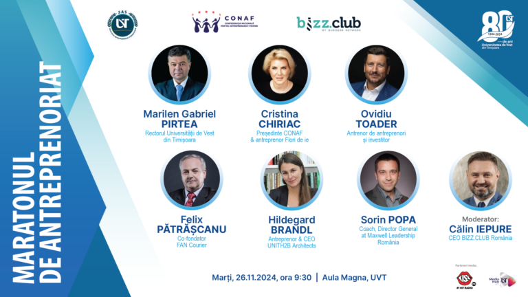 Universitatea de Vest din Timișoara vă invită să participați la o nouă ediție a „Maratonului de Antreprenoriat”, care va avea loc marți, 26 noiembrie 2024, începând cu ora 9:30, în Aula Magna a universității.