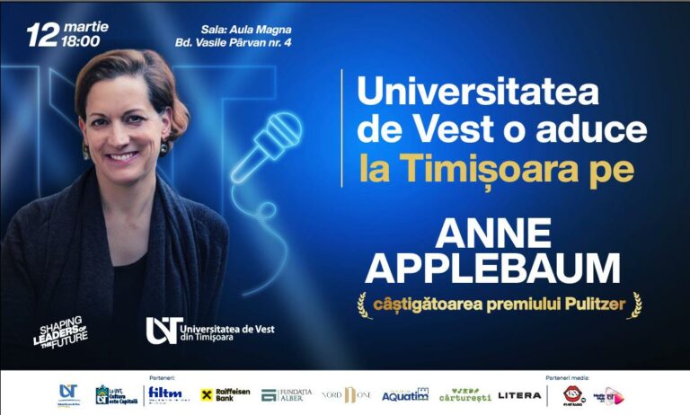 Evenimentul face parte din seria de dialoguri internaționale „Idei care schimbă lumea”, prin care UVT aduce la Timișoara personalități marcante ale dezbaterii globale. Dialogul cu Anne Applebaum va aborda teme precum fragilitatea democrațiilor contemporane, ascensiunea autoritarismului și responsabilitatea societăților libere într-un context internațional marcat de tensiuni și transformări profunde. Discuția va fi moderată de jurnalistul Marian Voicu.