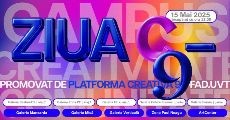 Vă invităm să participați la deschiderea oficială a Platformei Cretive 9, care va avea loc joi, 15 mai 2025, cu începere la ora 12:00, la sediul Facultății de Arte și Design (str. Oituz 4). Ne bucurăm să considerăm invitația deschisă și pentru publicul larg, pentru a cunoaște universul creativ al studenților și cadrelor didactice FAD-UVT, într-un context care celebrează expresia artistică, dialogul interdisciplinar și efervescența tinerei generații.