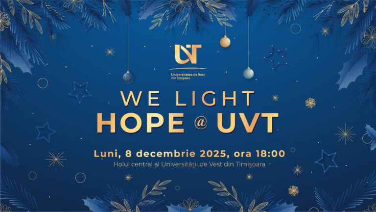 În 8 decembrie, de la ora 18, invităm întreaga comunitate alături de noi, în holul UVT, pentru ceea ce am pregătit sub motto-ul „We Light Hope @UVT”. Într-o perioadă în care este atât de important să fim aproape unii de alții, în preajma sărbătorilor de iarnă, când liniștea și tihna sunt atât de necesare, UVT dorește să aducă tuturor bucuria de a fi împreună. „We Light Hope @UVT” va fi un moment plin de căldură, bucurie și speranță. Vom aprinde luminile bradului de Crăciun, vom asculta și vom cânta colinde, ne vom înconjura de spiritul Crăciunului, dar, cel mai important, vom fi împreună.