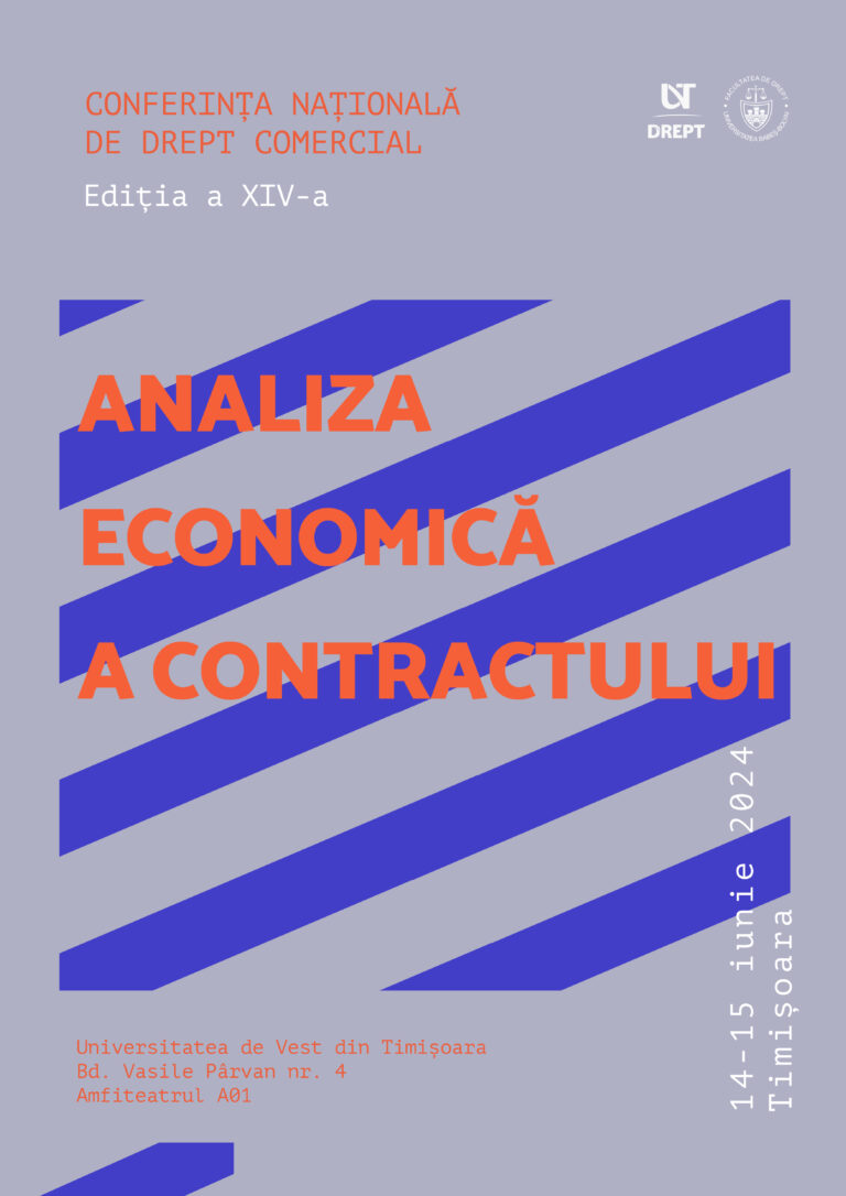 Facultatea de Drept din cadrul Universității de Vest din Timișoara, prin Centrul pentru Dreptul Afacerilor Timișoara, în colaborare cu Facultatea de Drept din cadrul Universității „Babeș-Bolyai” Cluj-Napoca, prin Centre for Business Law and Information Technology, organizează Conferința Națională de Drept Comercial, un eveniment științific intrat deja în tradiția celor două facultăți și aflat în centrul intereselor teoreticienilor și practicienilor dreptului afacerilor în România. Ajunsă la cea de-a paisprezecea ediție, conferința se va desfășura în perioada 14-15 iunie 2024, la Universitatea de Vest din Timișoara, Bd. Vasile Pârvan nr. 4, Amfiteatrul A01.