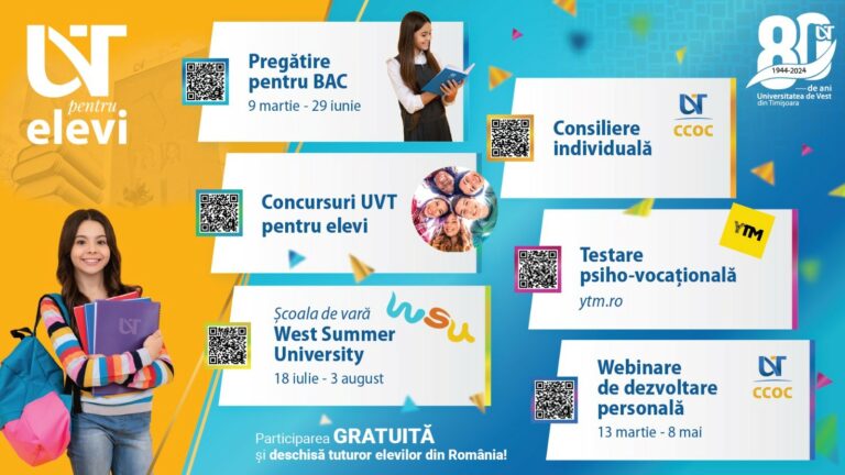 Universitatea de Vest din Timișoara (UVT) revine și în acest an universitar cu un amplu program de sprijin pentru elevii din întreaga țară, format din sesiuni de pregătire pentru examenul de bacalaureat, concursuri dedicate elevilor, webinare de dezvoltare personală și consiliere individuală în carieră.