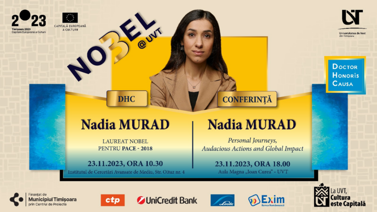 Comunitatea academică a Universității de Vest din Timișoara are bucuria de a vă invita să participați joi, 23 noiembrie 2023, ora 18, la conferința din seria „Nobel la UVT”, care va fi susținută de laureata Premiului Nobel pentru Pace, Nadia Murad. Conferința, desfășurată sub titlul „Personal Journeys, Audacious Actions and Global Impact”, va avea loc în Aula Magna „Ioan Curea” a UVT (V.Pârvan nr. 4). La eveniment va participa rectorul UVT, Marilen Gabriel Pirtea, oficialitățile invitate, cadre universitare și studenți, cercetători și alți invitați.