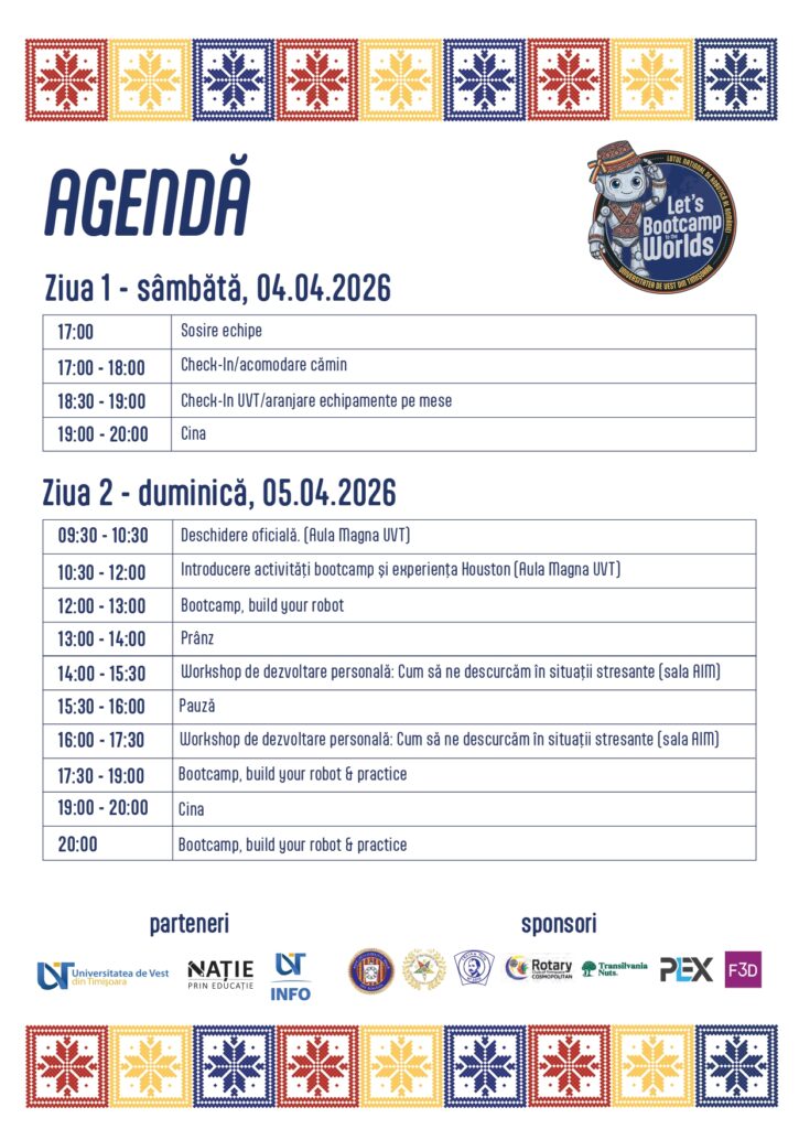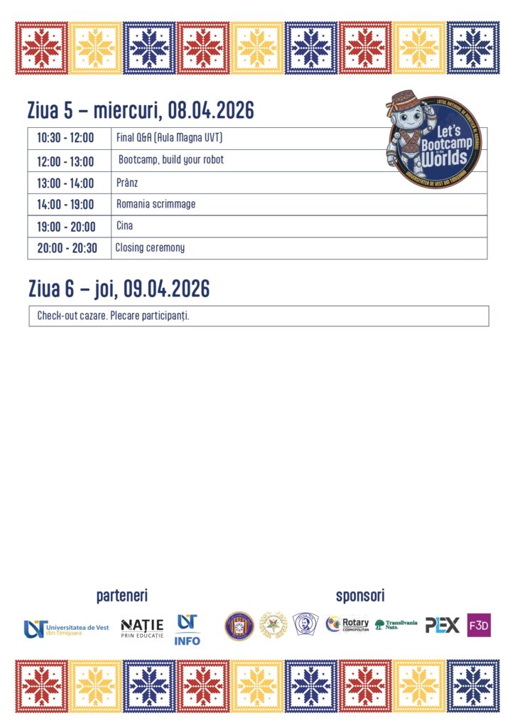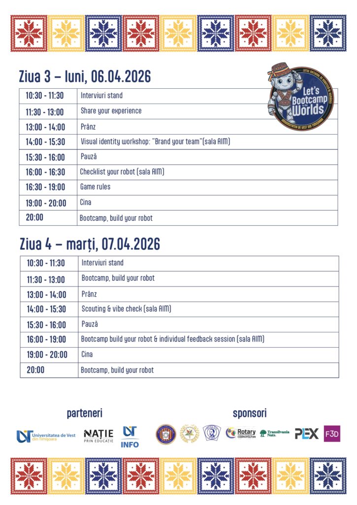- Pregătire tehnică & Workshop-uri: Echipele vor participa la sesiuni de optimizare a roboților, workshop-uri de dezvoltare personală pentru gestionarea stresului și branding de echipă.