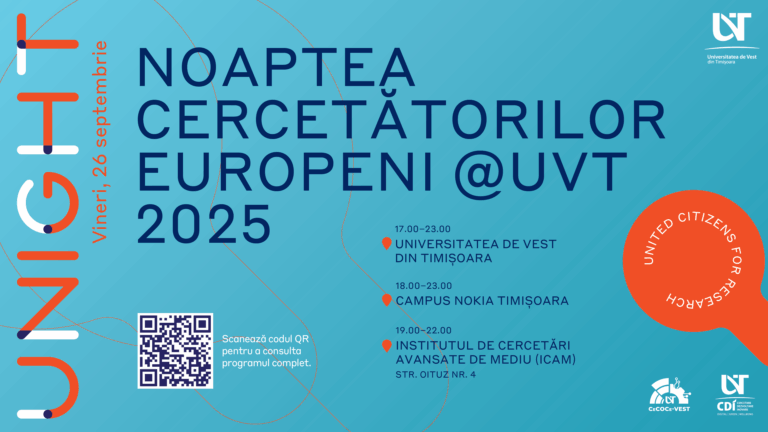Și în acest an, Universitatea de Vest din Timișoara (UVT) continuă tradiția de a promova știința printr-o serie de activități speciale, programate în seara de 26 septembrie 2025. Cercetători și cadre didactice vor fi implicați activ, iar evenimentele se vor desfășura în locațiile universității cele mai potrivite pentru explorarea și promovarea cunoașterii științifice: