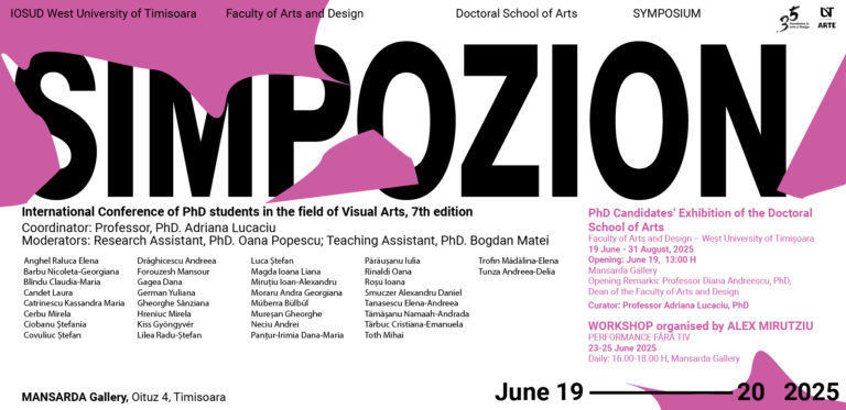 În perioada 19-20 iunie 2025, la Facultatea de Arte și Design a Universității de Vest din Timișoara se va desfășura a șaptea ediție a conferinței internaționale „SIMPOZION” – o platformă dedicată interacțiunii și schimbului de idei între doctoranzii din domeniul Artelor Vizuale, provenind din universități și facultăți de artă și design din țară și străinătate. Evenimentul este organizat de Școala Doctorală de Arte a UVT, parte integrantă a Alianței UNITA.