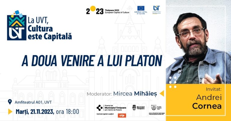 Unul dintre cei mai importanți și mai apreciați specialiști în filosofia antică din România, domnul Andrei Cornea va susține conferința „A doua venire a lui Platon”, marți, pe 21 noiembrie, de la ora 18:00, în Amfiteatrul A01. Evenimentul va fi moderat de Mircea Mihăieș, renumit critic literar, eseist și publicist.