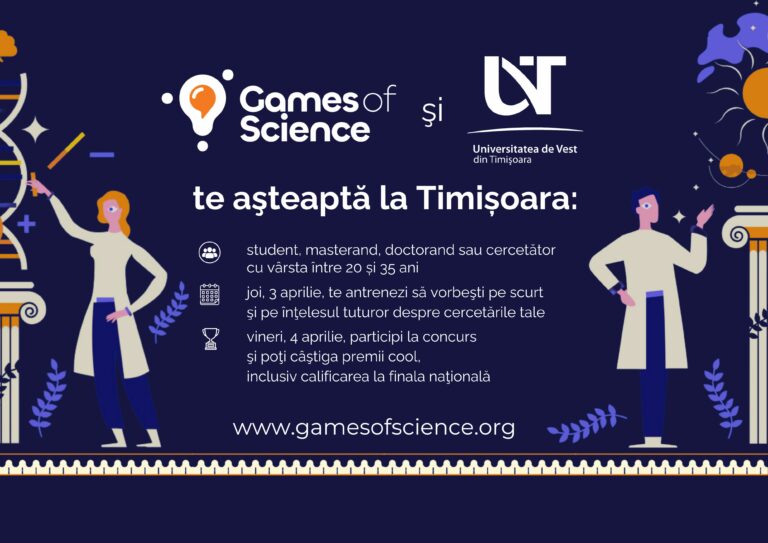 A patra ediție a Games of Science, cel mai cunoscut proiect românesc de popularizare a științei, ajunge la Timișoara pe 3 – 4 aprilie. În parteneriat cu Universitatea de Vest din Timișoara (UVT), competiția Games of Science invită studenți, masteranzi, doctoranzi și tineri cercetători din Timișoara și din zonele învecinate să participe la un training de opt ore, pe 3 aprilie 2025, după care să vină la concurs, care se va desfășura pe 4 aprilie 2025, pentru a-și prezenta cercetările într-un mod concis și captivant, pe durate de 15, 30, 60 și 180 de secunde.