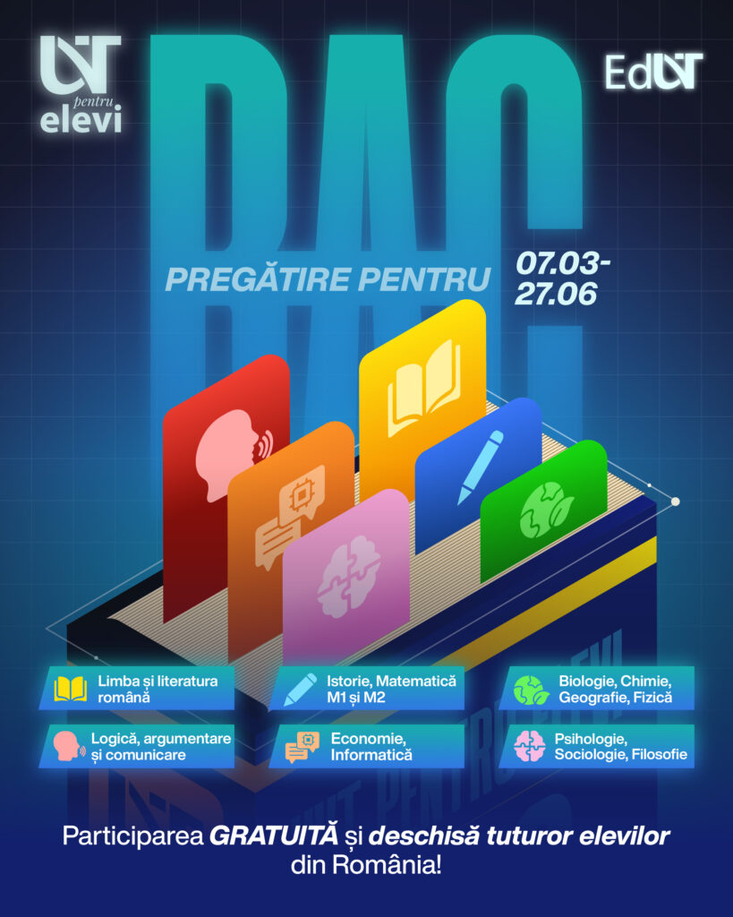 Programul de pregătire pentru examenul de bacalaureat va debuta în data de 7 martie 2026, urmând să fie organizate sesiuni de pregătire online gratuite săptămânal, sâmbăta, până în data de 27 iunie 2026, pentru toate disciplinele pentru care elevii urmează să susțină probe scrise. Înscrierea pentru participarea la programul de pregătire se realizează prin completarea ACESTUI FORMULAR, iar detaliile complete sunt disponibile AICI. Mai mult, UVT pune la dispoziția elevilor și o platformă cu resurse de învățare – bac.uvt.ro – unde aceștia pot găsi materiale didactice de pregătire și instrumente de testare pentru fiecare disciplină la care se susține probă scrisă în cadrul examenului de bacalaureat, precum și o serie de lecții video la disciplina limba și literatura română, toate pregătite și elaborate de cadre didactice universitare ale UVT.