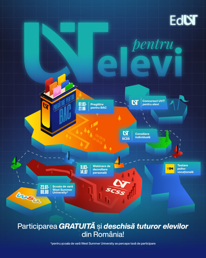 Nu în ultimul rând, Organizația Studenților din Universitatea de Vest din Timișoara (OSUT) și UVT propun și o oportunitate care se adresează elevilor din clasele a X-a și a XI-a: școala de vară West Summer University (WSU). Ediția WSU din anul 2026 se va desfășura în perioada 23.07-08.08.2026, iar înscrierea se poate realiza prin completarea ACESTUI FORMULAR până la data de 1 mai 2026. Mai multe detalii despre acest proiect sunt disponibile AICI.