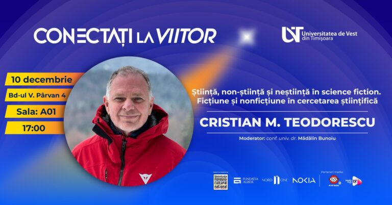 Vom avea parte de un dialog fascinant cu fizicianul Cristian M. Teodorescu, cercetător de elită, scriitor SF și una dintre vocile care explică cel mai limpede cum se influențează reciproc ficțiunea și știința. Evenimentul va avea loc pe 10 decembrie, de la ora 17:00, în amfiteatrul A01. Dialogul va fi moderat de conf. univ. dr. Mădălin Bunoiu, prorector UVT responsabil cu strategia CDI, sustenabilitate, transfer tehnologic și relația cu diaspora.