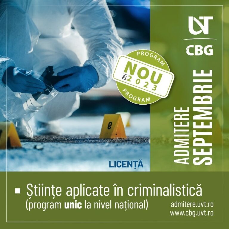 Avem bucuria de a vă invita să participați la evenimentul de lansare oficială a noului program de studii „Științe aplicate în criminalistică”, care va avea loc marți, 26 septembrie 2023, începând de la ora 9.30, la sediul Universității de Vest din Timișoara, în Amfiteatrul A01.
