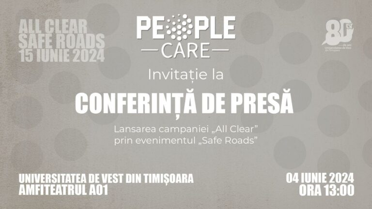 Avem onoarea de a vă invita să participați la conferința de presă organizată marți, 4 iunie 2024, ora 13, în amfiteatrul A01 al Universității de Vest din Timișoara, eveniment în care Asociația „People Care”, alături de partenerii săi, vor prezenta campania „All clear” și evenimentul „Safe roads”, care au ca obiectiv creșterea conștientizării publicului cu privire la riscurile implicate de consumul de alcool și droguri la volan, unul dintre principalele cauze ale accidentelor rutiere grave.