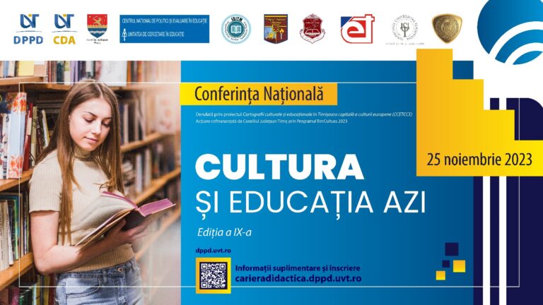 Universitatea de Vest din Timişoara, prin Departamentul pentru Pregătirea Personalului Didactic, va organiza cea de a noua ediție a Conferinței naționale „Cultura și educația azi”, proiect finanțat de Consiliul Județean Timiș prin intermediul Programului de finanțare nerambursabilă „TimCultura 2023”. Evenimentul va avea loc sâmbătă, 25 noiembrie 2023, în format hibrid, fiind anunțată participarea a peste 250 de participanți elevi, studenți, doctoranzi și cadre didactice din mediul preuniversitar și universitar din țară.
