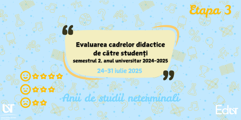 Încurajăm studenții să efectueze evaluări complete și cât mai detaliate pentru toate activitățile didactice la care au fost evaluați în acest semestru, asigurându-i de confidențialitatea informațiilor transmise! Doar colectând opiniile studenților și colaborând vom putea îmbunătăți calitatea procesului educațional din UVT!