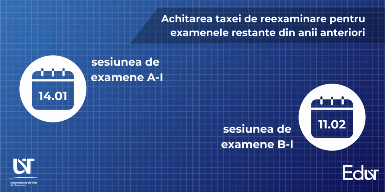 Vă reamintim că în conformitate cu reglementările Codului drepturilor și obligațiilor studentului și Regulamentului privind activitatea profesională a studenților de la ciclurile de licență și de masterat din UVT, studenții care au examene restante din anii anteriori trebuie să achite o taxă aferentă reexaminării de 100 lei/examen cu cel puțin 2 zile lucrătoare înainte de începerea sesiunii de examene în care doresc să susțină examenul respectiv.
